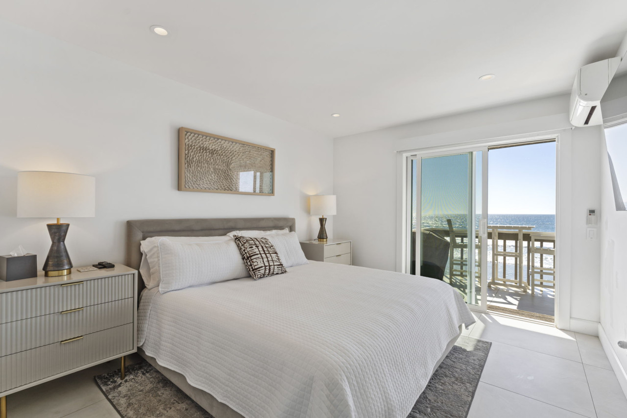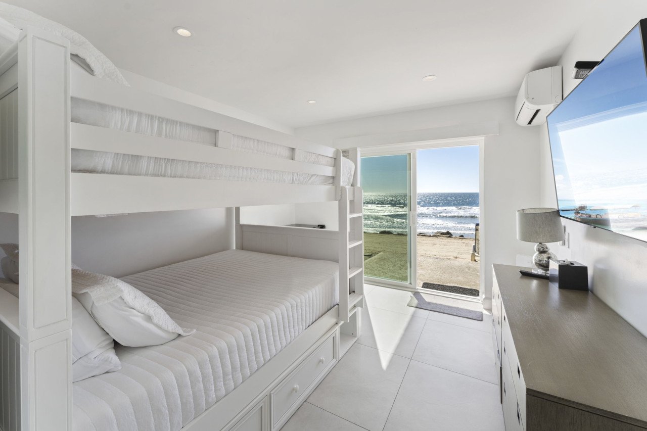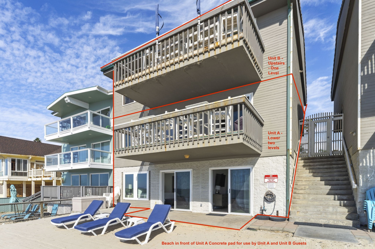 / nightWelcome to your ultimate beachfront escape! This stunning 3-bedroom, 3-bath, two-story owner’s unit offers sweeping ocean vistas, unmatched comfort, and exclusive access to the private beach below. Perfect for families or groups, this meticulously maintained property combines clean, modern design with a subtle coastal influence, creating an inviting and tranquil retreat. This listing is for Unit A, which occupies the bottom two floors of a three story condo/townhouse style building. Unit A is the townhouse style, entering the main floor from street level, and the lower level with bedrooms, laundry room, and direct beach access. Unit B is the upstairs condo style rental. Up one flight of stairs from street level, and occupying the entire top floor. Private beach access is granted via gate on street level, down one flight of stairs. The only shared spaces with Unit A and Unit B are the two-car garage (one space for each unit - large SUV will not fit), the driveway, and the private beach area. A Walk Through Your Stay: Main Living Area (Upstairs): Enter the open-concept main floor and be greeted by breathtaking ocean views from the private balcony. The spacious living area features plush sofas, a warm fireplace, and a large flat-screen TV with extended cable, creating the perfect space for relaxation or entertainment. The clean and modern decor complements the stunning coastal views, offering an ideal balance of style and comfort. The adjacent kitchen is sleek and modern, equipped with high-end appliances and everything you need to prepare delicious meals for your group. The dining area is conveniently integrated into the large kitchen island, creating a seamless and functional space for meals or casual gatherings. Bedrooms & Layout: This condo comfortably sleeps up to 8 guests: • Primary Suite (Downstairs): Luxurious king-size bed, split AC unit, flat-screen TV with cable, and direct access to the private beach via sliding doors. Includes an en-suite bathroom for added privacy. • Second Bedroom (Downstairs): Features two queen beds in a stacked bunk bed style, split AC, and a flat-screen TV with cable. This room also has sliding doors that open directly to the private beach area. • Third Bedroom (Upstairs): Located on the ground floor for easy access, this suite includes a king-size bed, sliding doors to the private balcony, and easy access to the upstairs bathroom. Bathrooms: The condo includes three thoughtfully designed bathrooms for your convenience: • Upstairs Bathroom: Easily accessible from the living area and third bedroom. • Primary En-Suite Bathroom (Downstairs): Serves the master suite with elegant fixtures and amenities. • Shared Downstairs Bathroom: Conveniently located for the second bedroom. Outdoor Features: This condo is a true paradise for beachfront living: • Private Balcony (Upstairs): Furnished for outdoor dining or morning coffee with unparalleled views of the Pacific Ocean and Oceanside Pier. • Private Beach (Downstairs): Accessible directly from the downstairs bedrooms. This exclusive area is reserved for building residents and offers a serene space for sunbathing or enjoying the sound of the waves. Additional Amenities: • Secure Parking: One designated spot in the on-site garage. • Air Conditioning: Split AC units in all bedrooms for personalized comfort. • Entertainment: TVs with extended cable in every bedroom and living room. • Washer & Dryer: Located in-unit for your convenience. Prime Location: Nestled along the picturesque coast of Oceanside, this condo offers direct beach access and proximity to the city’s best attractions. Stroll to local restaurants, boutique shops, or the iconic Oceanside Pier. For a day of adventure, explore nearby Carlsbad Village or rent an e-bike to cruise along the scenic coastline. Important Notes: • Requires Stairs • This is a non-smoking, no-pet property. • Parties or events are not permitted to ensure a peaceful environment for all guests. Surfer and Ocean Lovers Paradise! South Oceanside — or as the locals lovingly refer to it, South O — is a neighborhood that’s known for its deep roots and authentic personality. The charming business district has recently undergone a revitalization, sporting new restaurants, collaborative artisan retail spaces, and nightly entertainment. Outside of the main business corridor, the South O neighborhood touts a beautiful beach, retro bowling alley, freshwater lagoon, and nature center; perfect for family-friendly adventures.