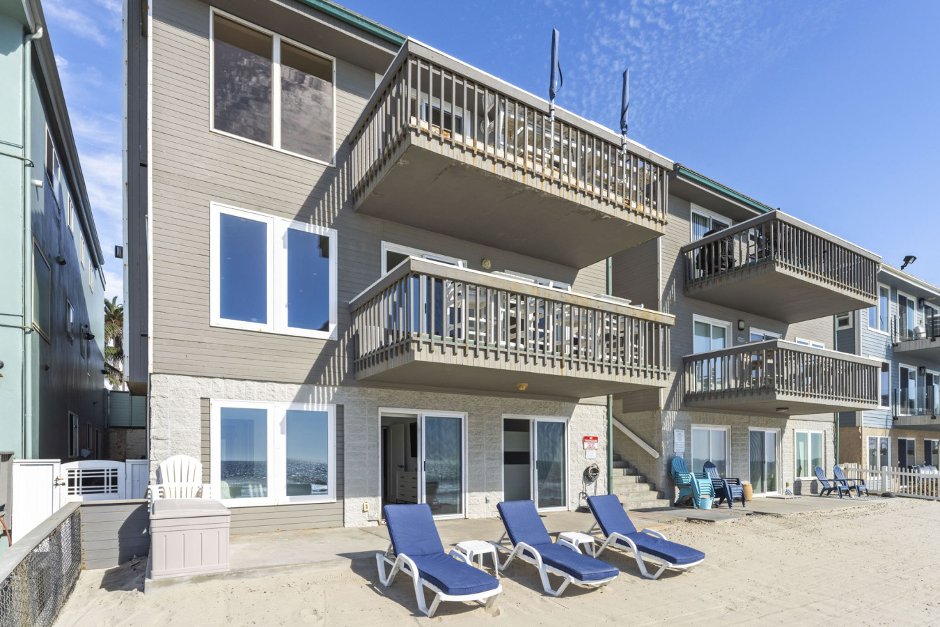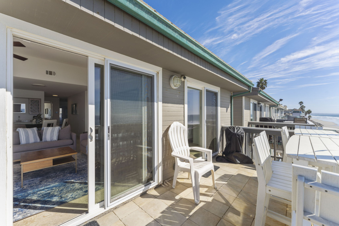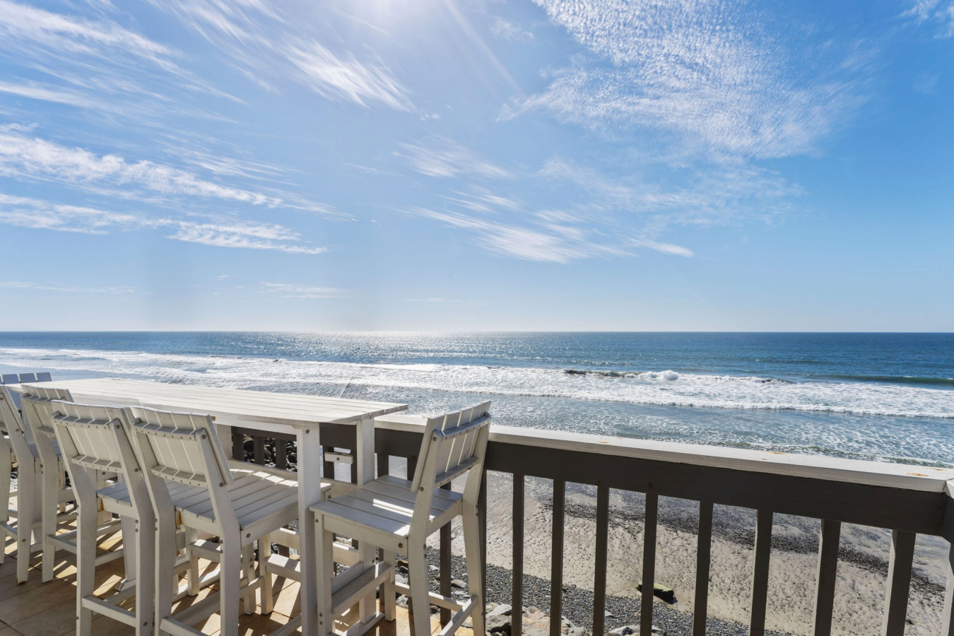 / nightOceanfront Home with Private Balcony & Private Beach Welcome to your ultimate beachfront retreat! This stunning 3-bedroom, 2-bath condo offers the perfect blend of relaxation, style, and comfort. With awe-inspiring ocean views from the living room and primary bedroom, you’ll be immersed in coastal living from the moment you arrive. Enjoy exclusive access to your private balcony and semi-private beach, shared only with the lower unit. This listing is for Unit B, which occupies the upper floor of a three story condo/townhouse style building. Unit B is the condo style, entering front door and up one flight of stairs from street level, occupying the entire top floor. Private beach access is granted via gate on street level, down one flight of stairs. The only shared spaces with Unit A and Unit B are the two-car garage (one space for each unit - large SUV will not fit), the driveway, and the private beach area. A Walk Through Your Stay: As you step into the condo, you’ll be greeted by a spacious open-concept living and dining area, designed to capture the stunning ocean vistas. Sink into the cozy seating in the living room, the perfect place to unwind with a movie or simply watch the waves roll in. Adjacent to this space is the fully equipped kitchen, stocked with everything you’ll need to prepare delicious meals for your group. The private balcony, accessible from the living room and primary bedroom, is a true highlight of this property. It’s the ideal spot for morning coffee or evening cocktails, with the ocean breeze and soothing sound of waves as your backdrop. Bedroom Layout: This condo comfortably sleeps up to 8 guests with the following arrangement: • Primary Bedroom: King-size bed, ocean views, and direct access to a shared bathroom. • Second Bedroom: Two queen beds, perfect for families or friends. • Third Bedroom: Two twin beds, great for kids or additional guests. The two bathrooms ensure everyone has plenty of space to freshen up after a day at the beach. Outdoor Features: Step outside and walk down the stairs to your semi-private beach, shared only with guests of the lower unit. This tranquil stretch of sand is perfect for enjoying the beauty of the Pacific Ocean. For those who prefer a shaded spot, the private balcony offers a serene outdoor space with oceanfront seating to relax and recharge. Additional Features: • High-speed WiFi throughout the condo. • Smart TVs in the living area for entertainment. • Fully equipped kitchen. • Washer and dryer in the unit for convenience. • One Dedicated garage parking for your stay. Prime Location: Located in South Oceanside, this condo is nestled in a vibrant community with easy access to local attractions. Stroll or bike to nearby restaurants, artisan shops, and entertainment venues. Explore the beautiful beach, nearby freshwater lagoon, and nature trails for family-friendly adventures. Important Notes: • Stairs Required • No pets are allowed in this unit. • This is a non-smoking property. • Semi-private beach is shared with the lower unit but offers ample space to enjoy.